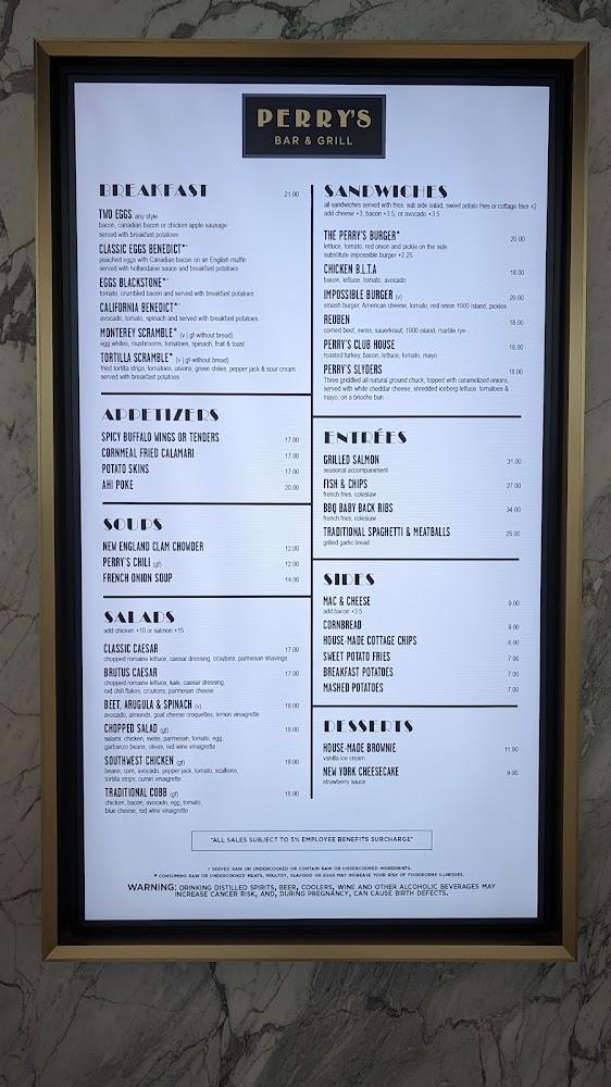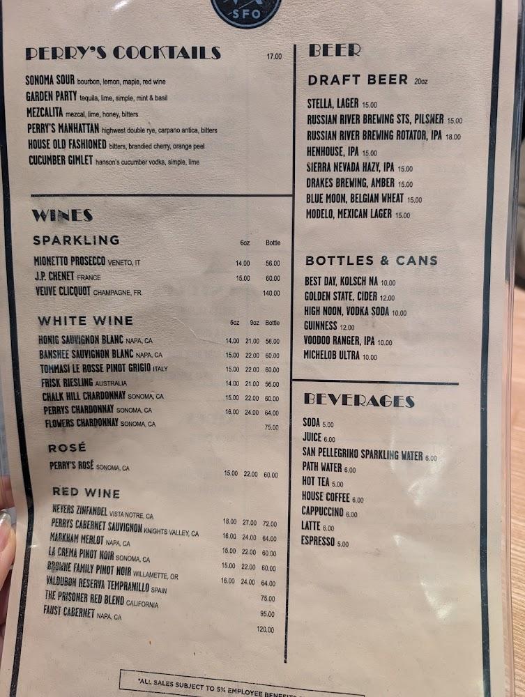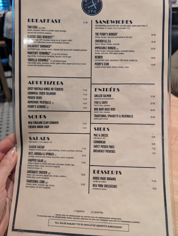Welcome to Perry's SFO, located conveniently in Terminal 1 of San Francisco International Airport. Our American restaurant offers a relaxed atmosphere perfect for travelers seeking a delicious meal on the go. Enjoy a diverse menu featuring hearty breakfasts, delightful lunches, and comforting dinners, including favorites like Chicken Sandwiches and Eggs Benedict. With a wide selection of beers, cocktails, and wines, you'll find the perfect drink to complement your meal. Our prompt service, takeout options, and wheelchair accessibility make dining easy and enjoyable for everyone. Stop by Perry's SFO and savor a taste of home before your next flight!